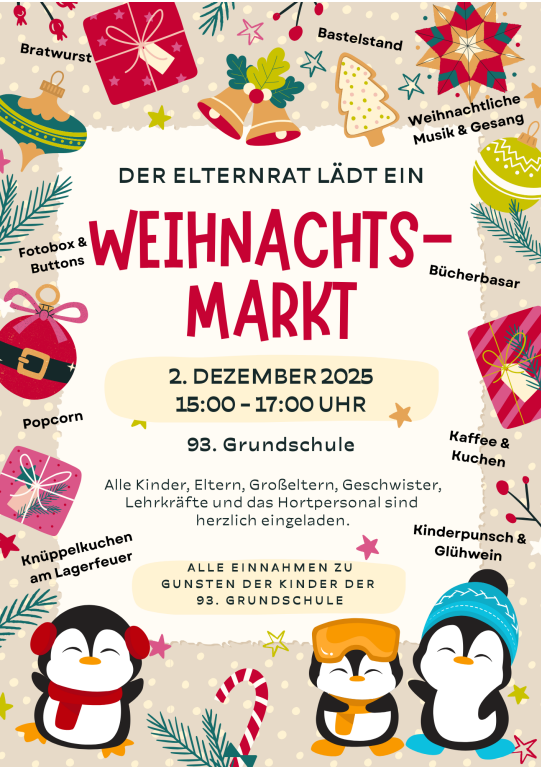 Der Elternrat der 93. Grundschule lädt am 2. Dezember 2025 von 15:00 bis 17:00 Uhr herzlich zum diesjährigen Weihnachtsmarkt auf dem Schulgelände ein.