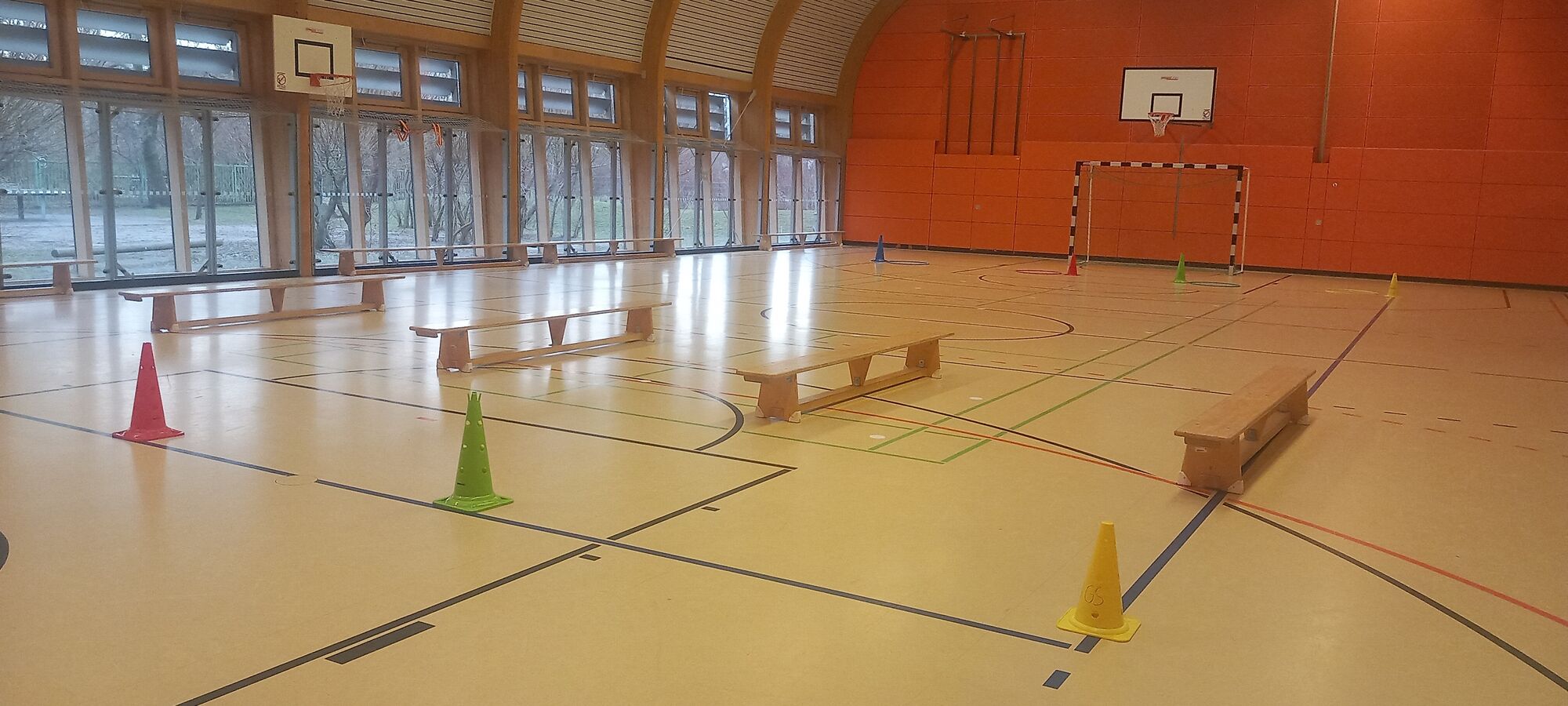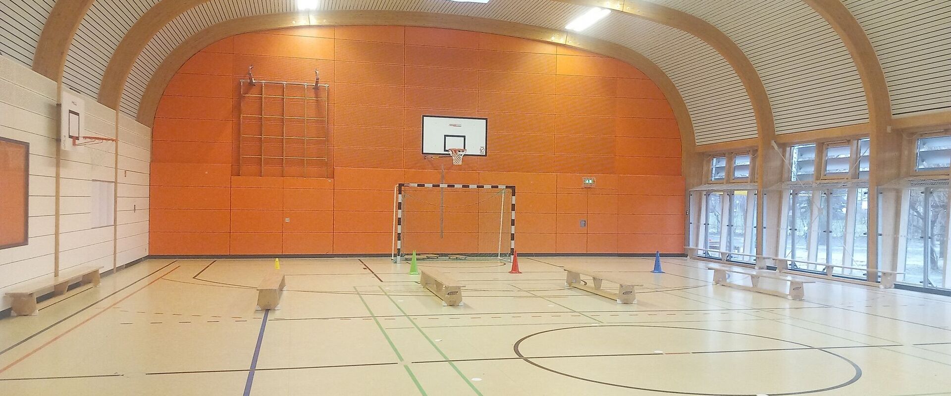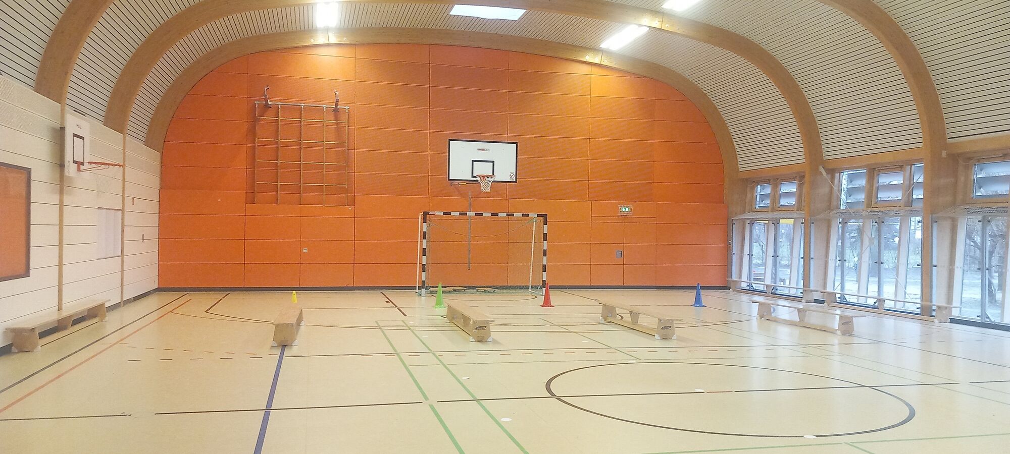 Unsere multifunktionale Turnhalle bietet vielfältige Bewegungsmöglichkeiten für einen abwechslungsreichen Sportunterricht. Sie verfügt über verschiedene große und kleine Geräte für die Ausübung verschiedener Sportarten wie Turnen, Leichtathletik, Volleyball, Basketball, Fußball, Handball und kleine Spiele.