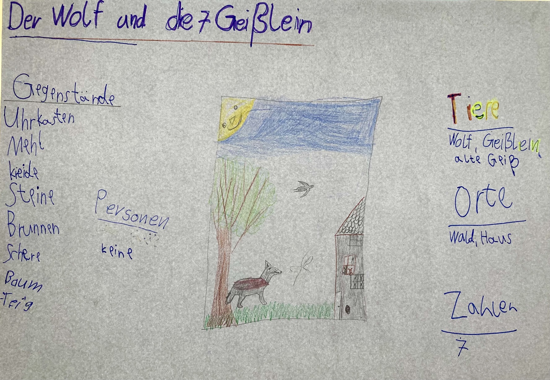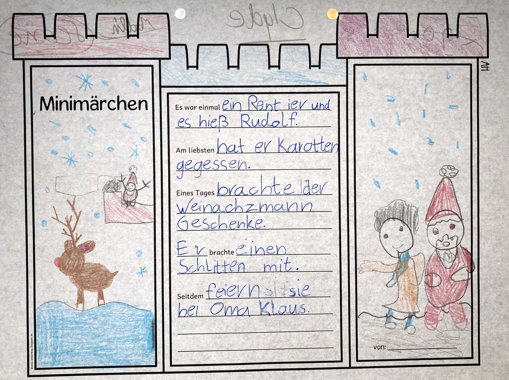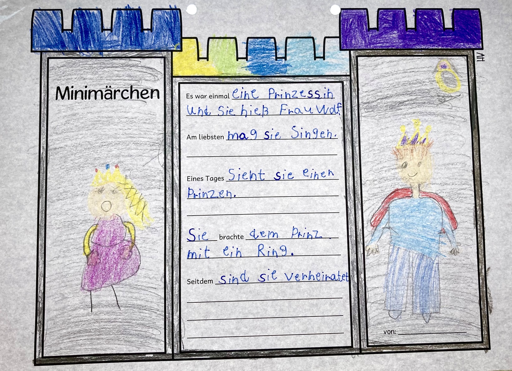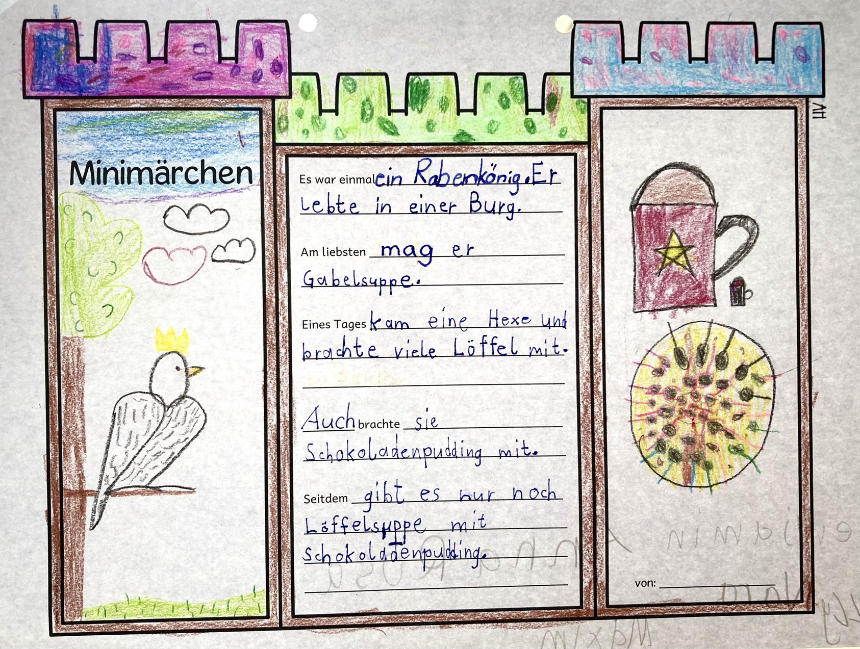 Als Abschluss des Projekts verfassten die Gruppen eigene Minimärchen, die aus jeweils fünf Sätzen bestanden. Diese Aufgabe forderte die Kinder heraus, sich auf das Wesentliche zu konzentrieren und mit wenigen Worten eine vollständige Geschichte zu erzählen.