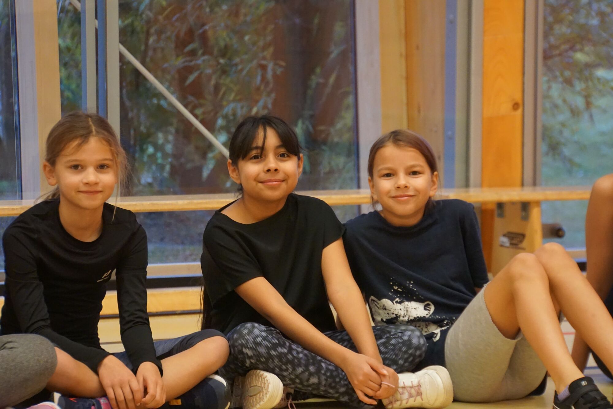 Los ging es mit einer gemeinsamen Erwärmung in Form eines lustigen Tanzes, bei dem alle ins Schwitzen kamen. Begleitet wurde dieser von den drei Sportlehrerinnen Frau Groß, Frau Dubiel und Frau Linke.