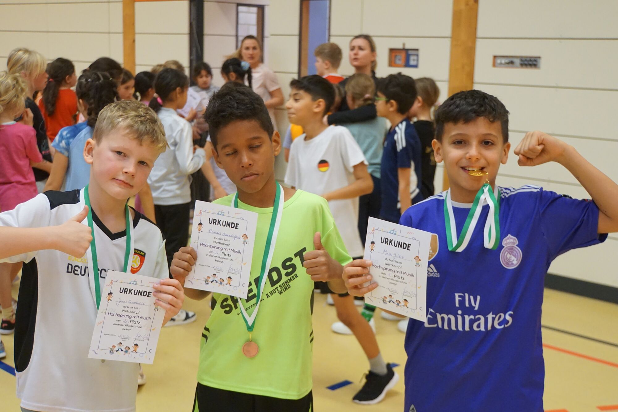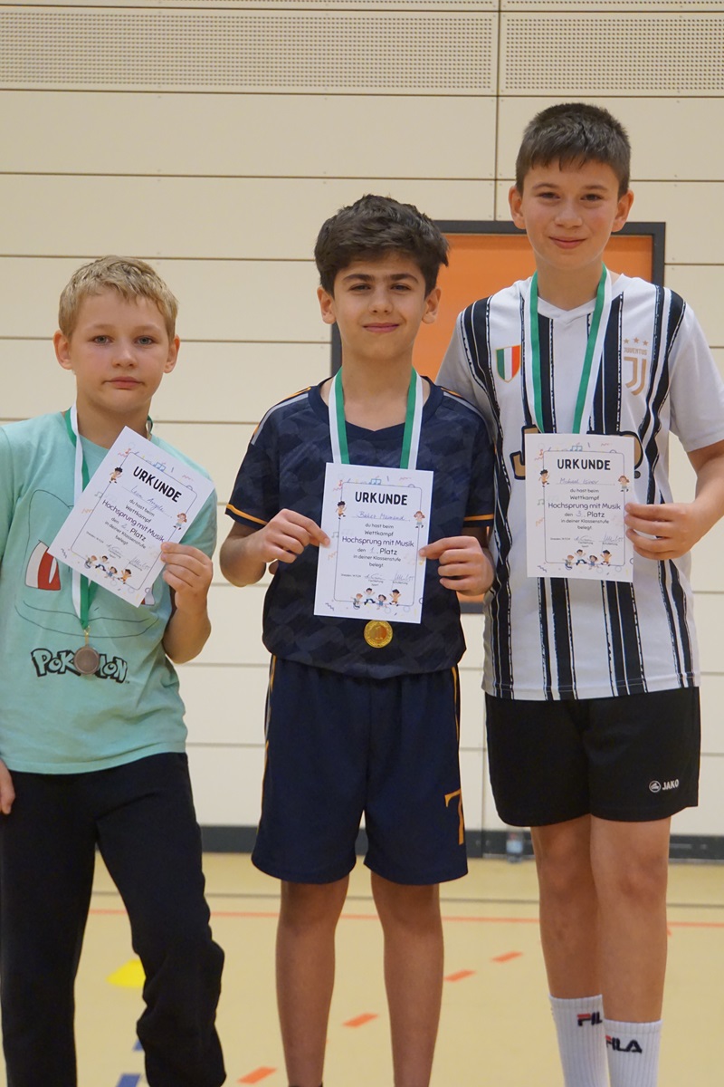 Anschließend ging es hoch hinaus! Alle Schülerinnen und Schüler konnten zeigen, wie gut sie die Technik beim Hochsprung beherrschen (Schersprung). Die Stimmung in der Halle war wirklich spitze. Die begleitende Musik motivierte zusätzlich. Alle Kinder feuerten sich gegenseitig an und wir erlebten einen fairen und sehr spannenden Wettkampf. Am Ende kam es zu einem Finale unter den Besten der Besten. Abgerundet wurde der Wettkampf mit einer Siegerehrung. Hier wurden die Sieger und Platzierten mit Medaillen belohnt. Alle Schüler und Schülerinnen erhielten eine Urkunde als Erinnerung. Es war ein super Tag! Eine Wiederholung folgt sicher nächstes Jahr.
