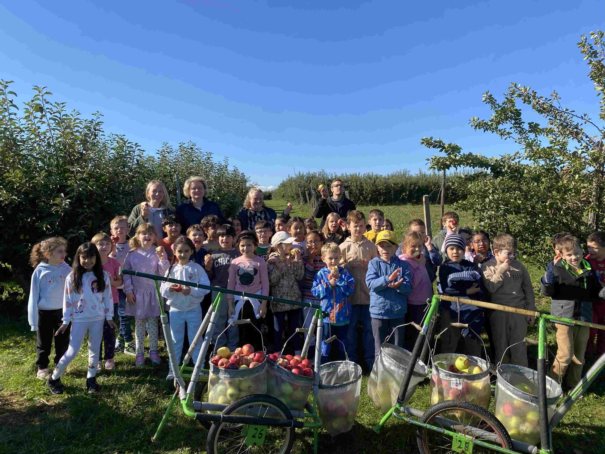 In der letzten Schulwoche vor den Ferien widmete sich die Klassenstufe 1 dem Thema Apfel. Auftakt dieser besonderen Projektwoche war die Wanderung zur Apfelplantage in Sobrigau. Die gepflückten Äpfel wurden in den darauffolgenden Tagen mit allen Sinnen erforscht: Wir bestimmten die Teile eines Apfels, fertigten erste Sachzeichnungen an und verarbeiteten einen Großteil der Ausbeute zu süßem Saft. Am Ende der Woche durfte jedes Kind seinen eigenen, hübsch verzierten Schokoapfel mit nach Hause nehmen. Auf den folgenden Seiten gewinnen Sie einen kleinen Einblick zu diesen stimmungsvollen Tagen.