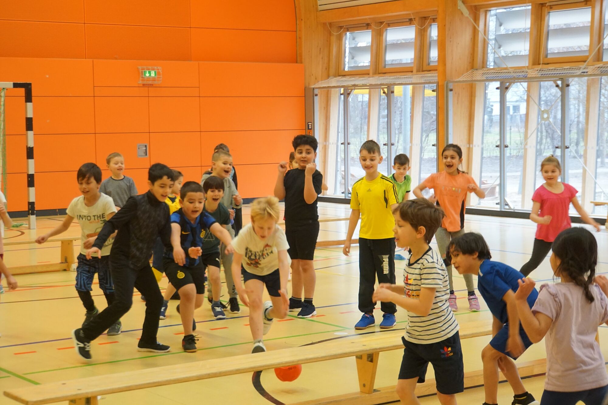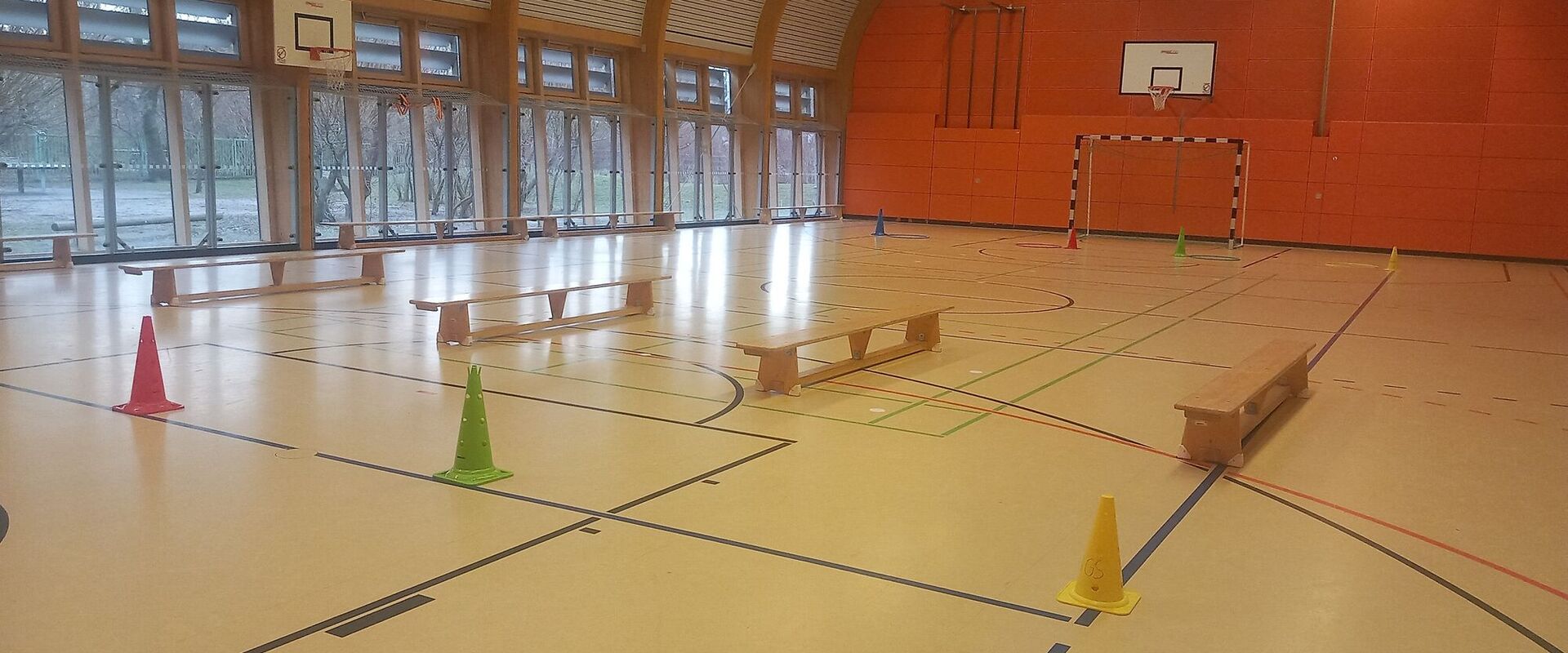 Unsere multifunktionale Turnhalle bietet vielfältige Bewegungsmöglichkeiten für einen abwechslungsreichen Sportunterricht. Sie verfügt über verschiedene große und kleine Geräte für die Ausübung verschiedener Sportarten wie Turnen, Leichtathletik, Volleyball, Basketball, Fußball, Handball und kleine Spiele.