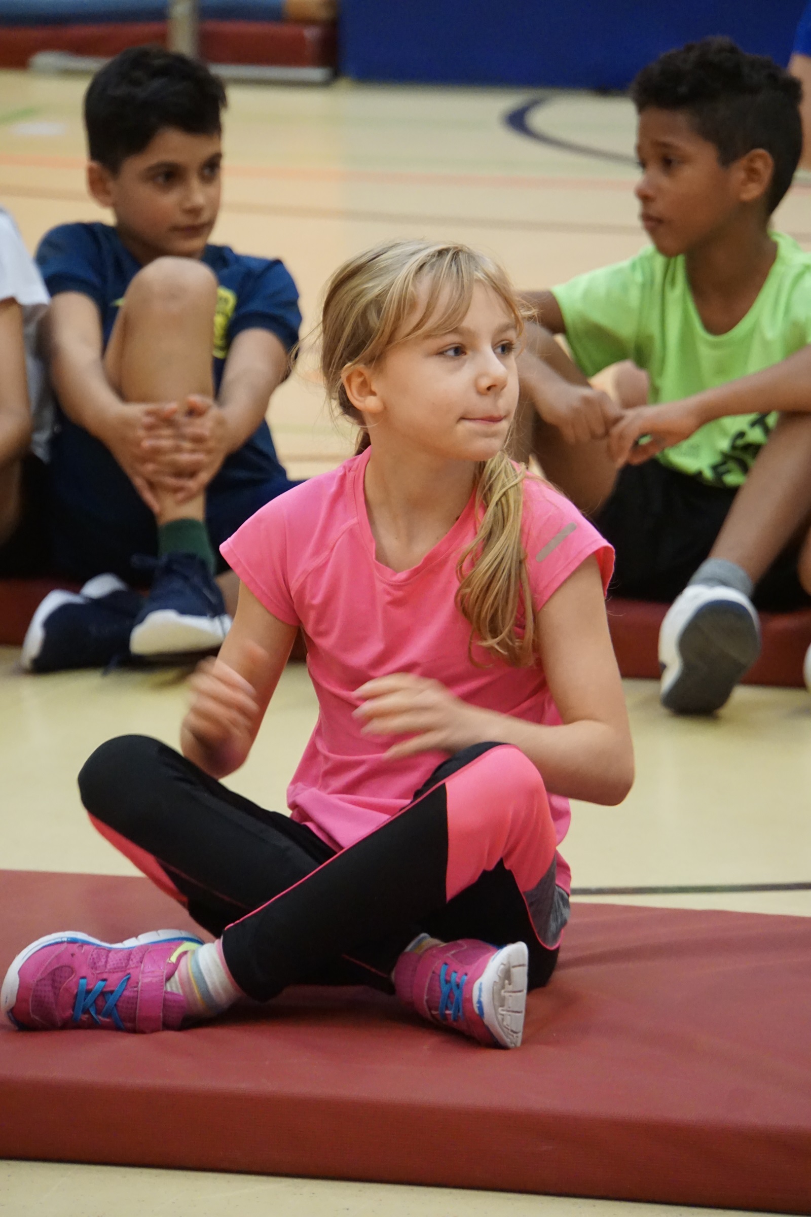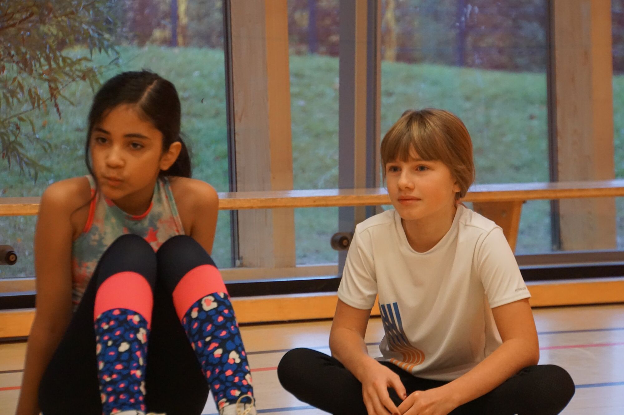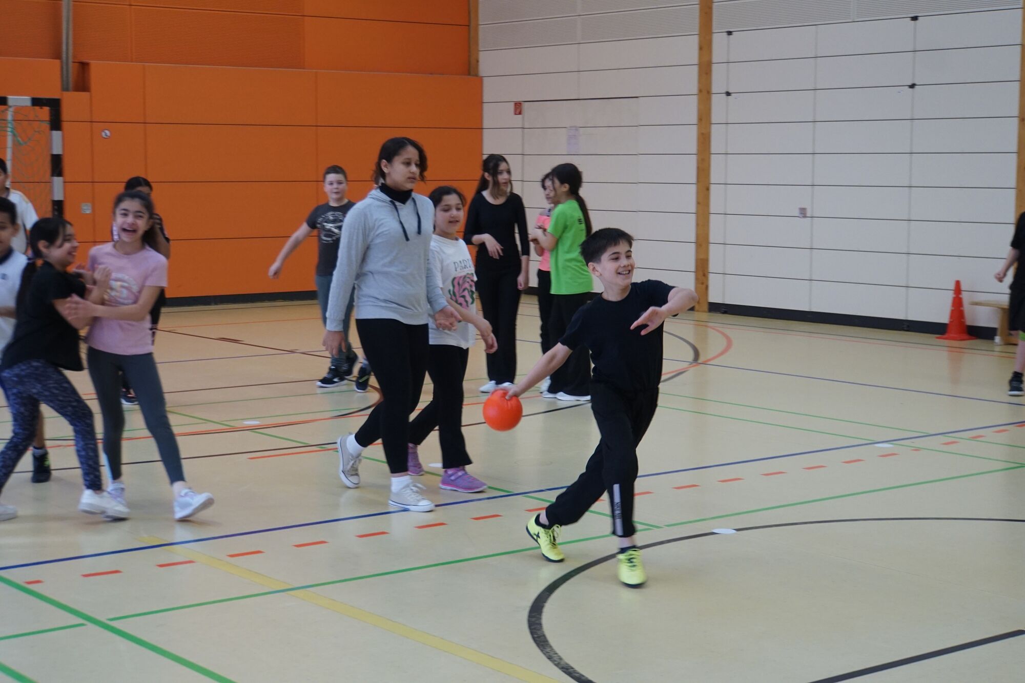 Los ging es mit einer gemeinsamen Erwärmung in Form eines lustigen Tanzes, bei dem alle ins Schwitzen kamen. Begleitet wurde dieser von den drei Sportlehrerinnen Frau Groß, Frau Dubiel und Frau Linke.