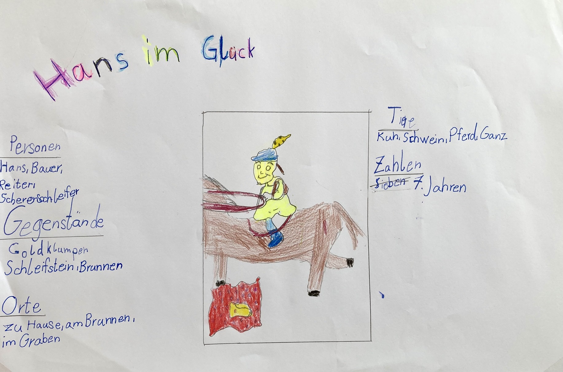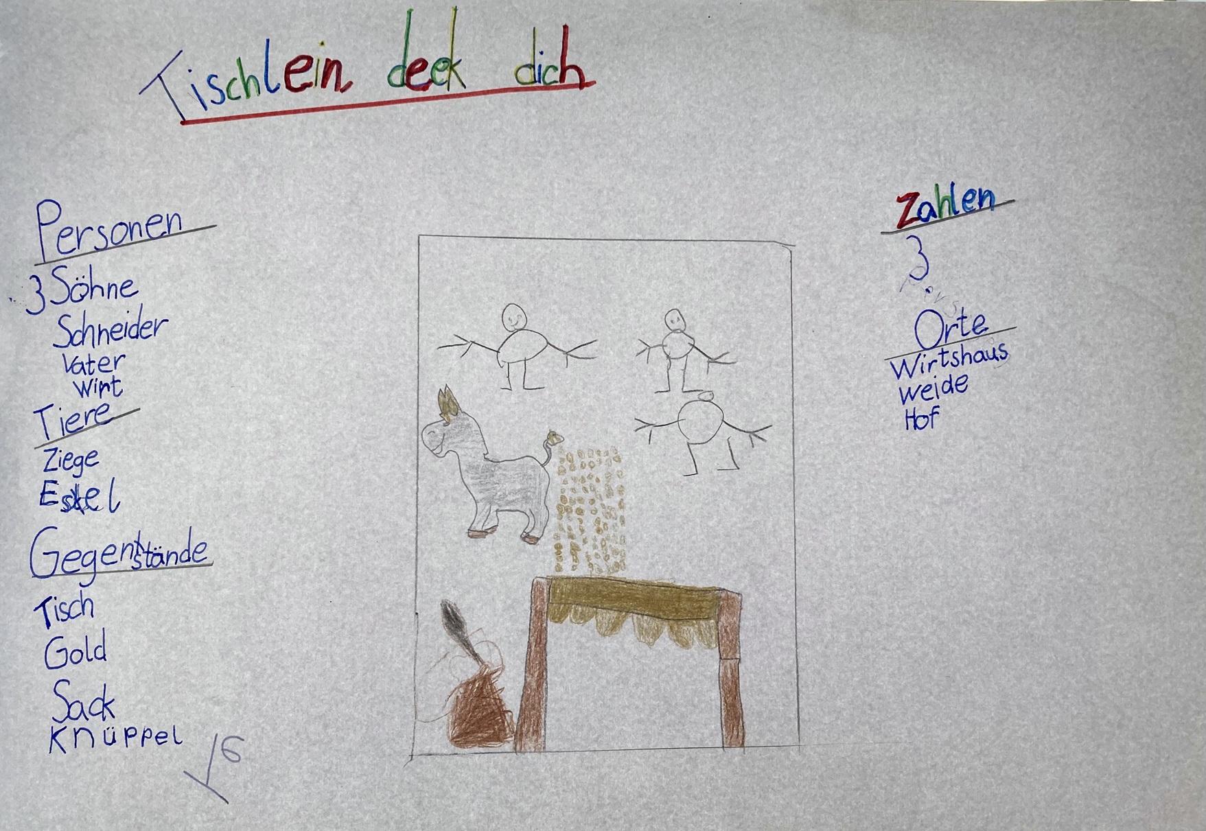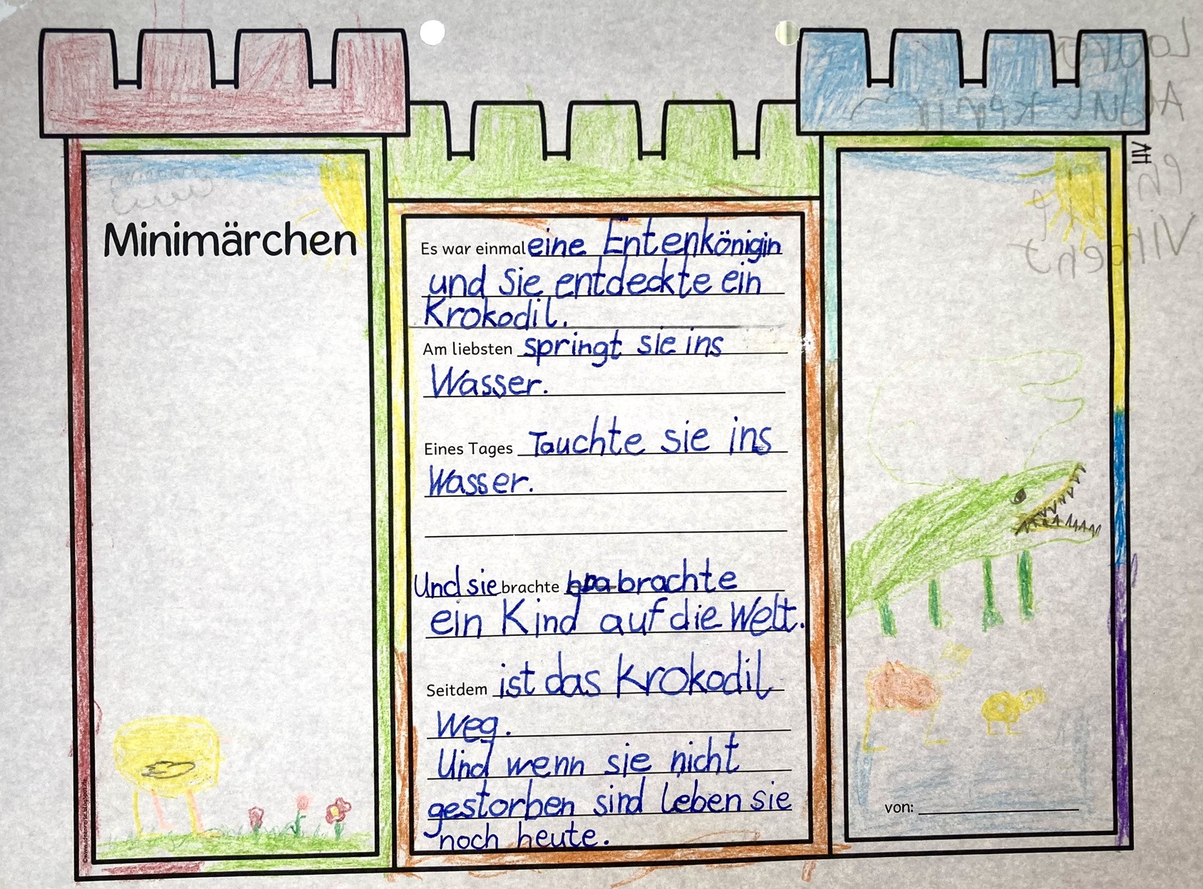 Als Abschluss des Projekts verfassten die Gruppen eigene Minimärchen, die aus jeweils fünf Sätzen bestanden. Diese Aufgabe forderte die Kinder heraus, sich auf das Wesentliche zu konzentrieren und mit wenigen Worten eine vollständige Geschichte zu erzählen.