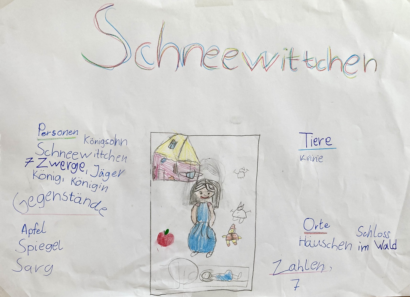 In Gruppenarbeit lasen die Schülerinnen und Schüler verschiedene Märchen und entdeckten deren typische Merkmale. Sie erforschten, was den „roten Faden“ eines Märchens ausmacht, also den Handlungsstrang und die wiederkehrenden Motive. Die Ergebnisse ihrer Arbeit hielten sie auf Plakaten fest.