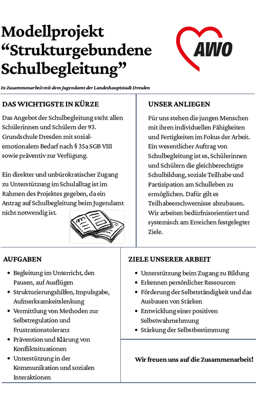 Das Angebot der Schulbegleitung steht allen Schülerinnen und Schülern der 93. Grundschule Dresden mit sozialemotionalen Bedarf nach §35a SGB VIII sowie präventiv zur Verfügung.